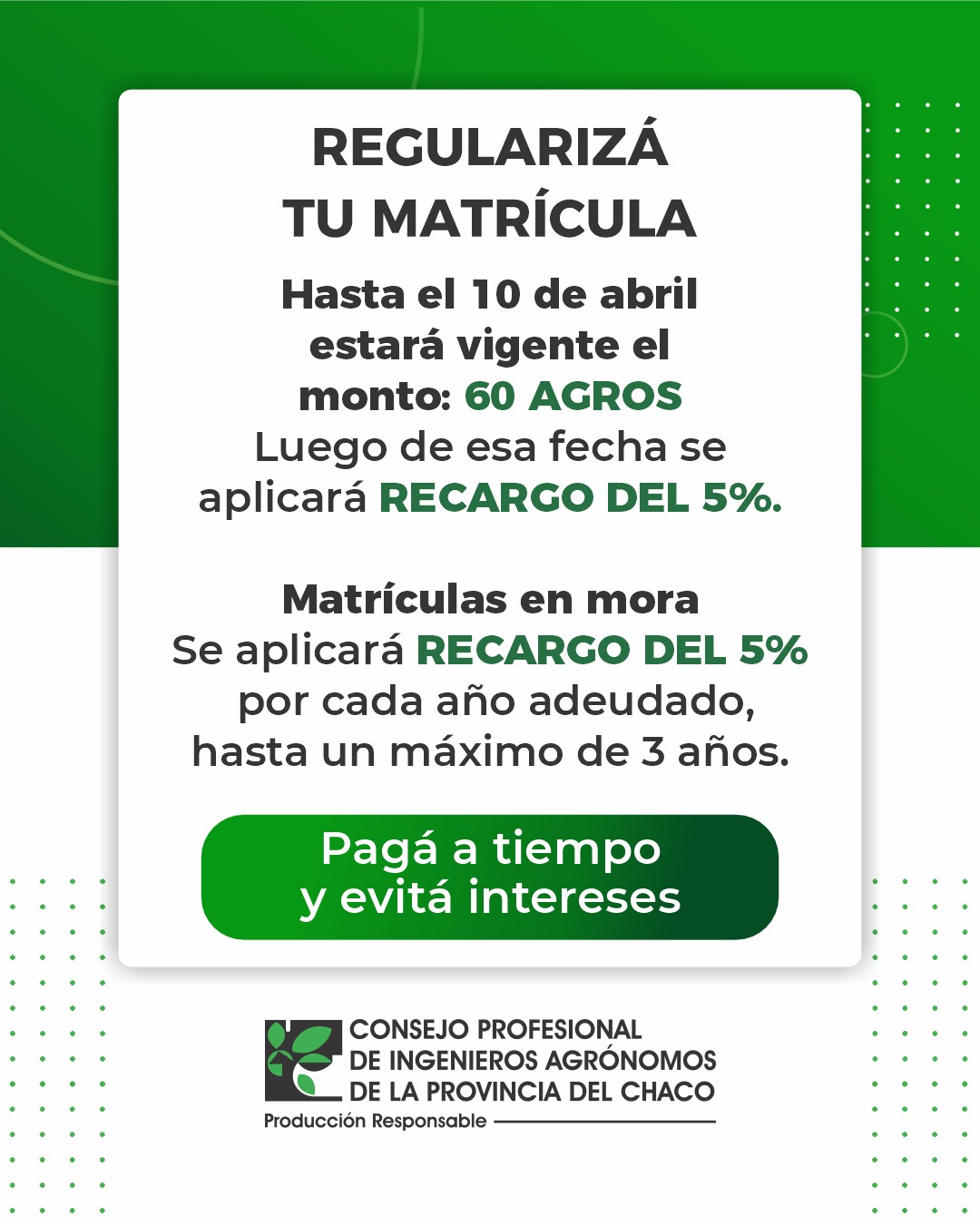 Hasta el 10 de abril, el monto vigente es de 60 AGROS. Luego de esa fecha, se aplicará un recargo del 5%.